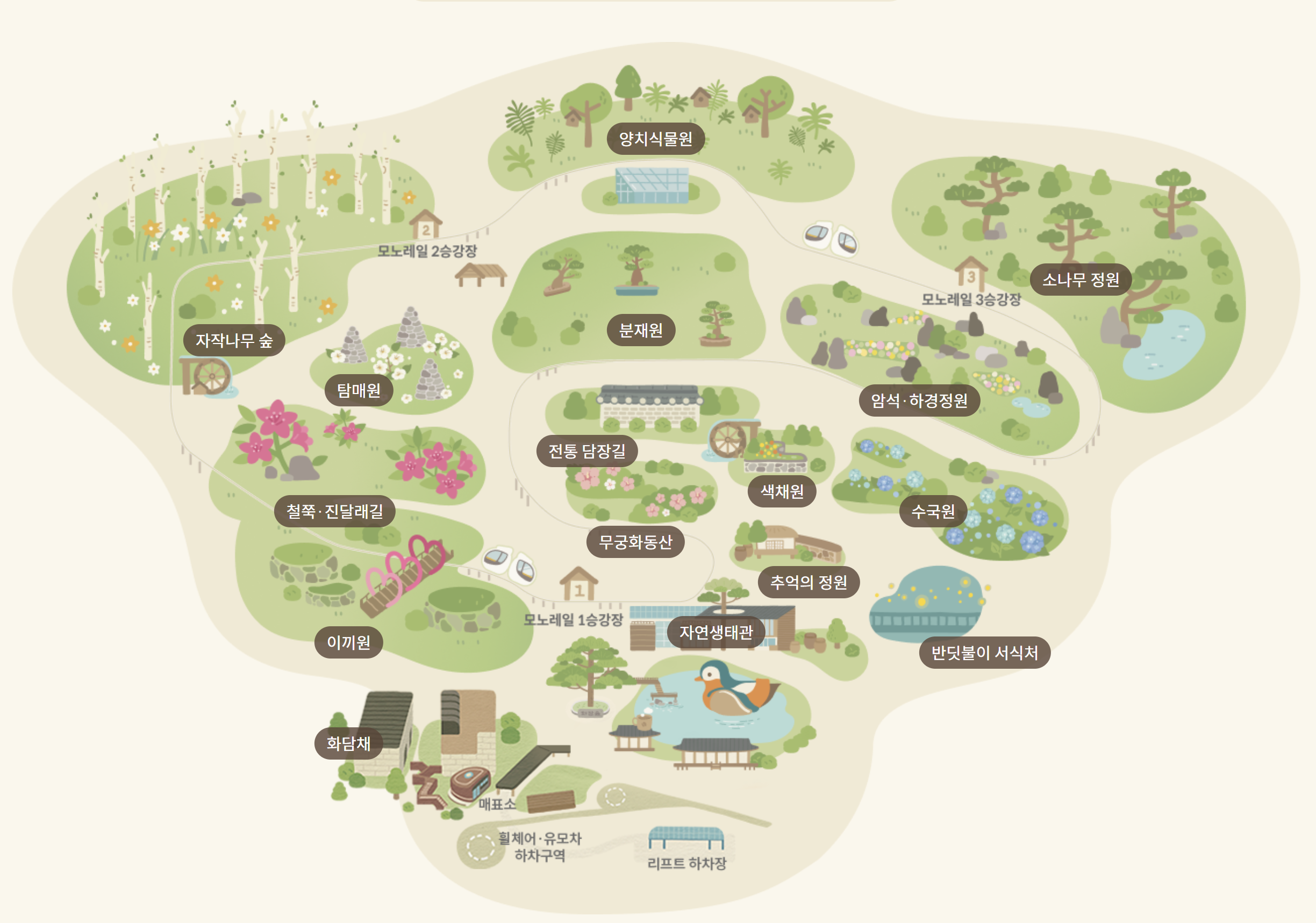 추천 코스: 이끼원 → 자작나무숲 → 소나무정원 → 분재원 → 전망대