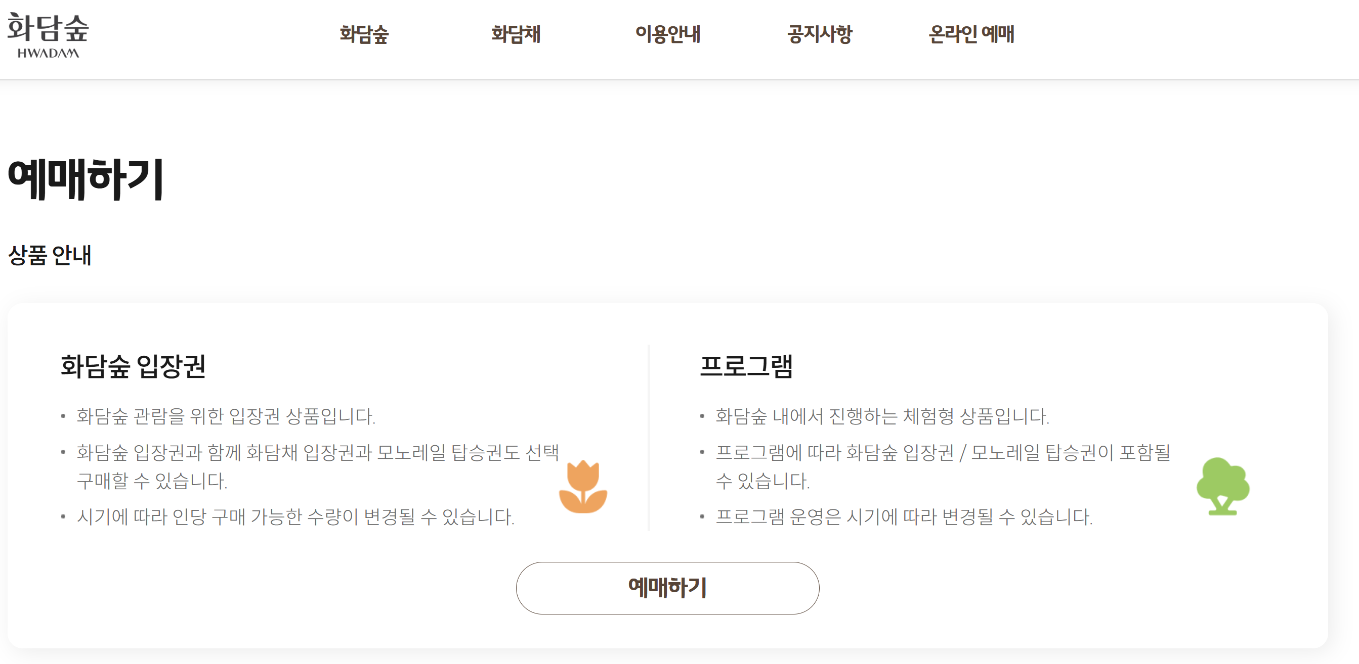 예매하기 상품 안내 <!-- url 이동하는 기존 코드 --> 화담숲 입장권 화담숲 관람을 위한 입장권 상품입니다. 화담숲 입장권과 함께 화담채 입장권과 모노레일 탑승권도 선택 구매할 수 있습니다.