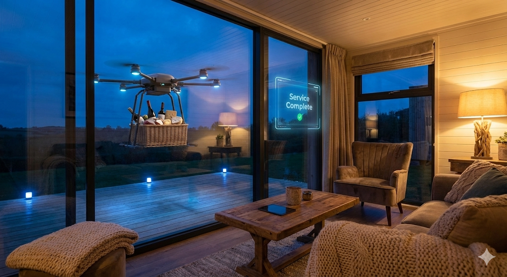 체크인? 로비에 갈 필요 없습니다. 글램핑 입구에서 안면 인식이나 홍채 인식으로 문이 스르륵 열리니까요. 룸서비스가 필요하다면 태블릿을 두드릴 필요도 없습니다. 허공에 대고 "레드 와인 한 병이랑 치즈 플래터 부탁해"라고 말만 하면 됩니다. 15분 뒤, 조용한 드론이 테라스의 지정된 드롭 존(Drop Zone)에 우아하게 착륙해 주문한 메뉴를 내려놓고 사라집니다. 🚁🍷